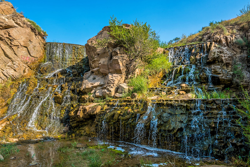 长流水源于百年前,成于自然中。沿沟逆流而上,长流水峡谷内有三处较大的瀑布最为引人,三大瀑布各具特色。第一瀑布为虎口瀑布,因形似虎口而得名,整个瀑布宽约14米,落差约7米;在广袤的沙漠之地能看到如此景观实为奇迹;第二瀑布为榆树湾瀑布〈也叫蛇尾瀑布〉,因此瀑布处生长有一棵百年榆树而得名,瀑布落差竟达27米,是3处瀑布中落差最大的一处,此瀑形如蛇身,流水潺潺,清泉叮咚声响,溢满峡谷,不禁让人叹服大自然的鬼斧神工;第三大瀑布为双龙口瀑布,是三大瀑布中最宽的一处,瀑宽约达18米,清澈的泉长从高耸的龙口中喷涌而下,在这幽深的山谷峡涧显的尤为灵动。